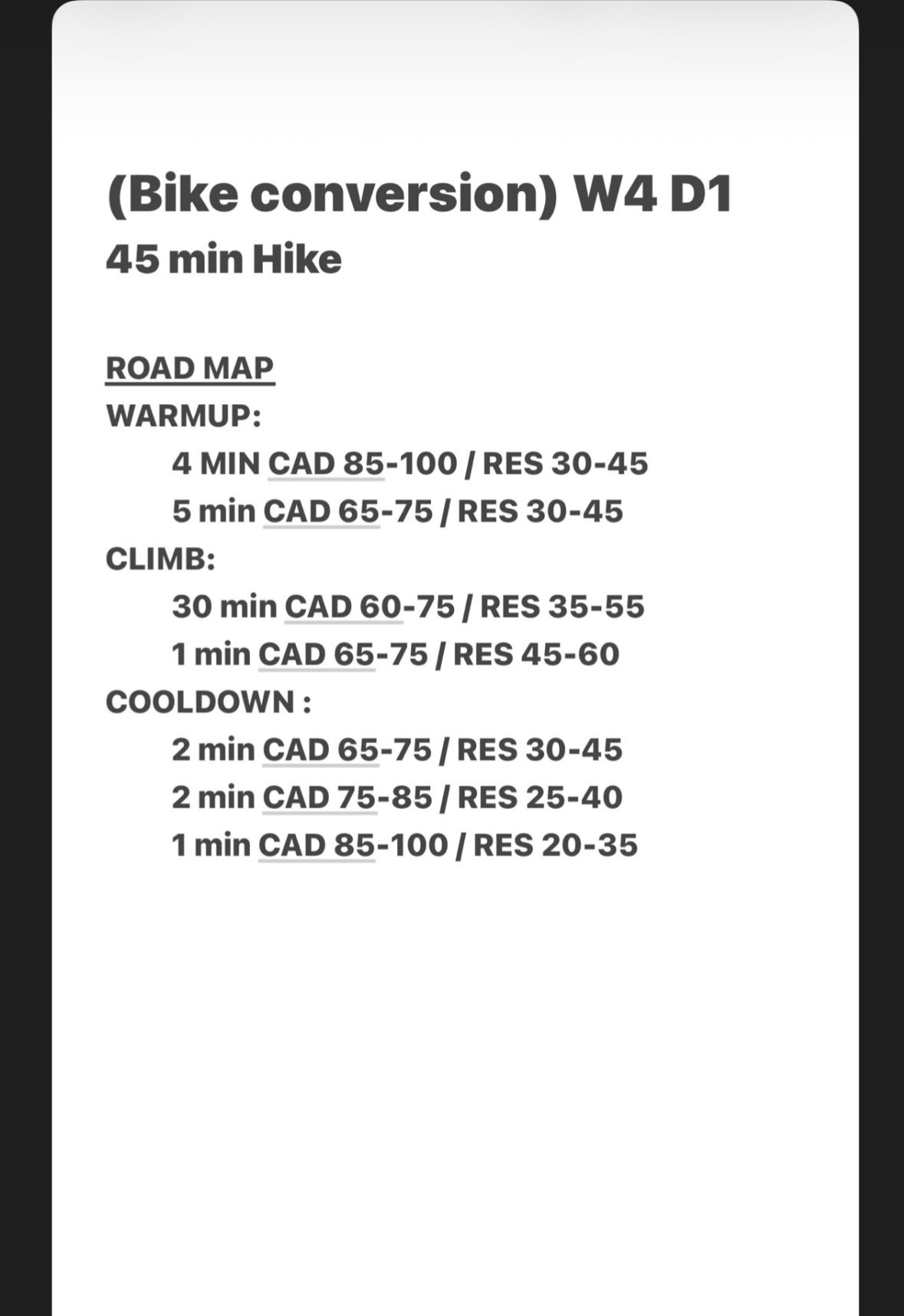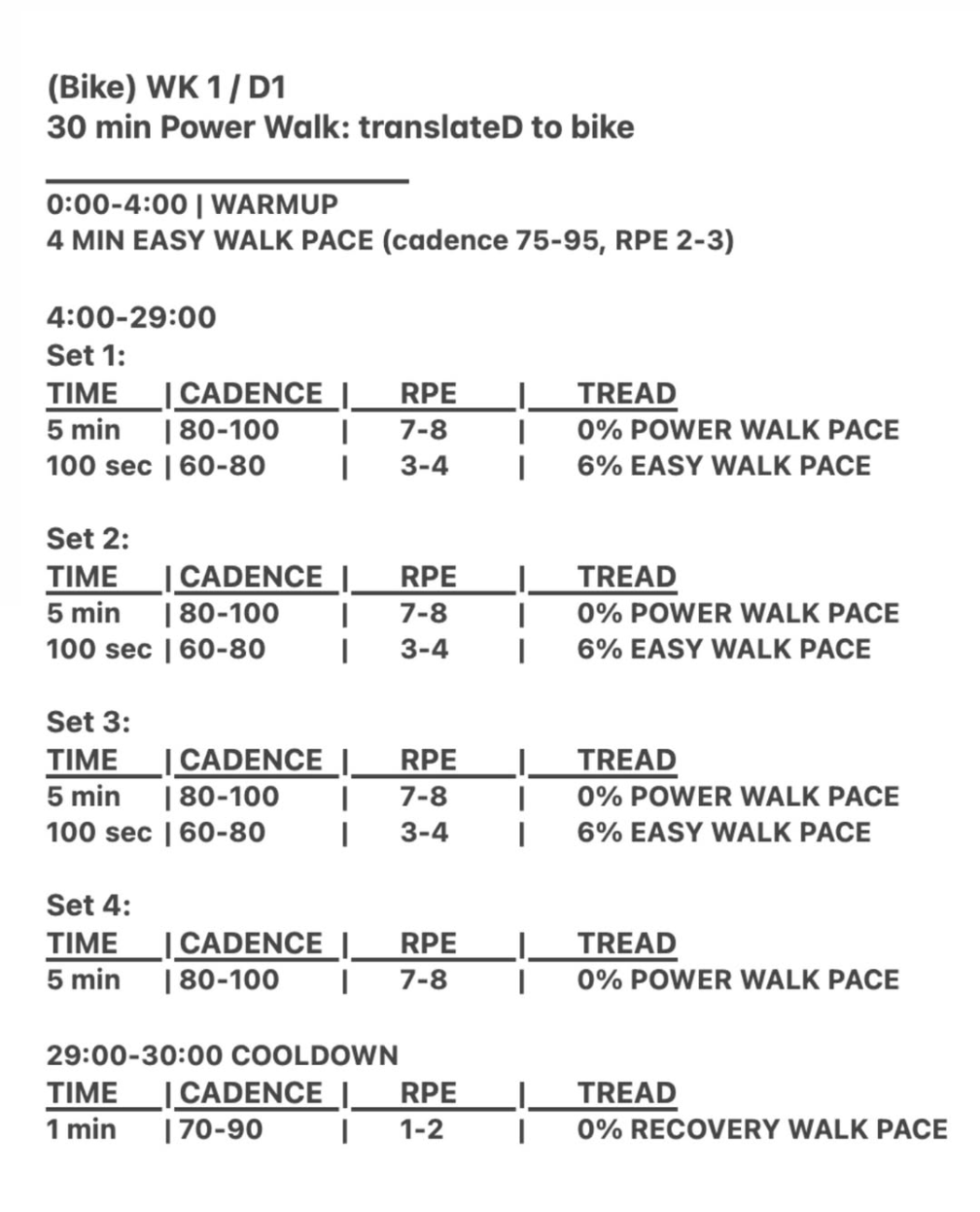 Click here to DOWNLOAD the WEEK 4, Day 1 Conversion from from TREAD to BIKE callouts.