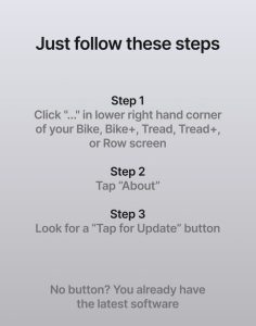 Follow these steps to make sure you are running the latest software. If you don’t see a button asking you to update then it’s been updated automatically and you’re good to go! Original equipment won’t have the premium features on the Cross Training Series, but you will have enhancements that improve your workouts.