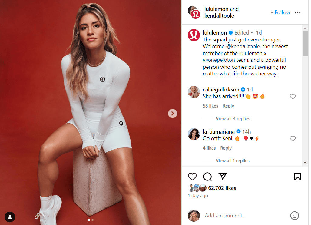 “The squad just got even stronger. Welcome @kendalltoole, the newest member of the lululemon x @onepeloton team, and a powerful person who comes out swinging no matter what life throws her way.”